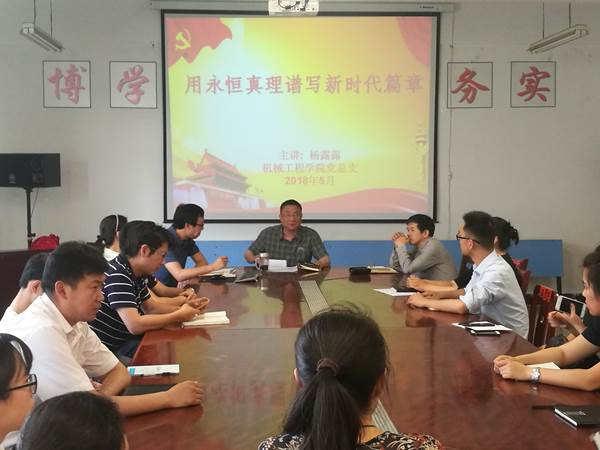 59日下午,机械工程学院召开全体党员会议,学院党总支书记杨露露以《用永恒真理谱写新时代篇章》为题为全院教师党员上了一堂生动的党课。